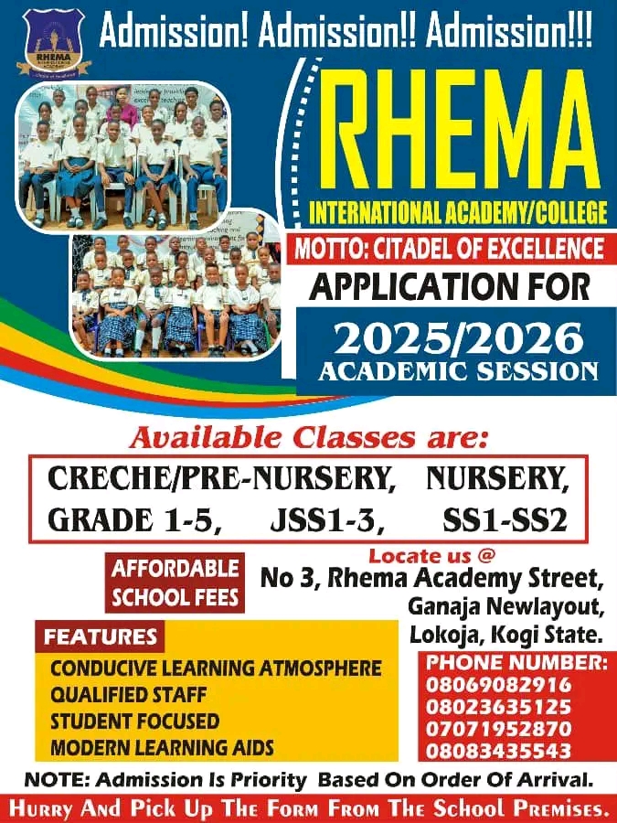Admission into RHEMA INTERNATIONAL ACADEMY for the 2025/2026 academic session is in progress.